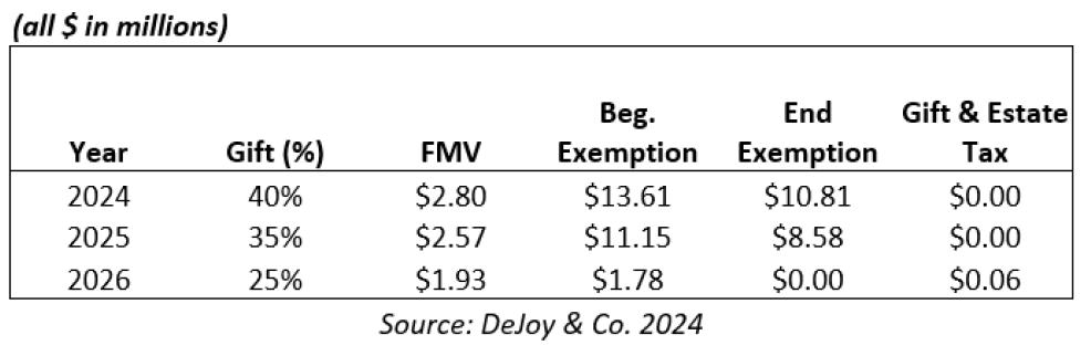 Example #2: Let’s go back to Bob’s estate plan. We projected $3.6 million in tax savings by gifting 100% of ABC Co. to his daughter today instead of a cash gifting strategy. However, if the exemption limit is halved as expected on Jan. 1, 2026, then the numbers are very different. Bob will have no exemption left at his date of death and, therefore, the full $16.3 million estate will be exposed to estate tax of $6.5 million.
