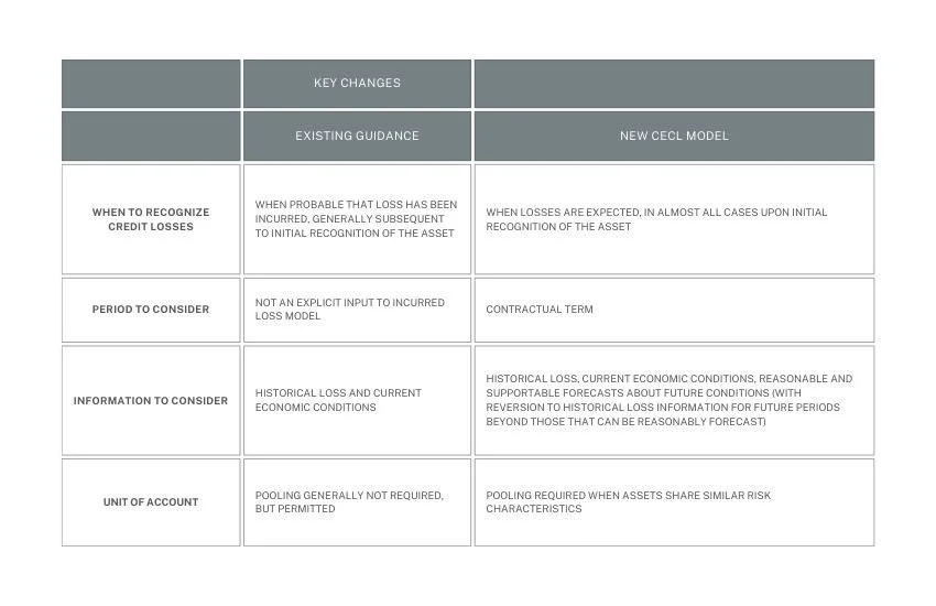 Key changes from existing guidance to the new CECL model are summarized below:
