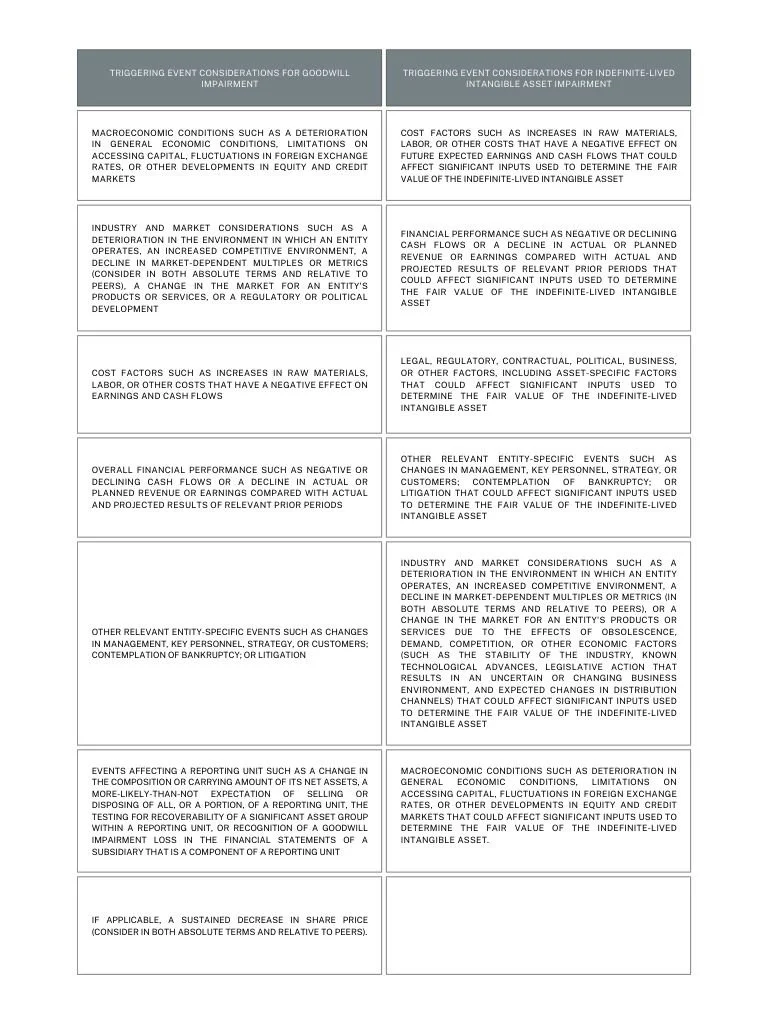 ASC 350, which deals with the impairment of goodwill and indefinite-lived intangible assets, lists the following common triggering events (which are not all inclusive):
