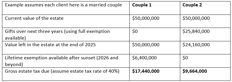 Key takeaway: An additional $7.78 million is paid in estate taxes by the couple who failed to utilize the expanded exclusion amount before it expires in 2025.